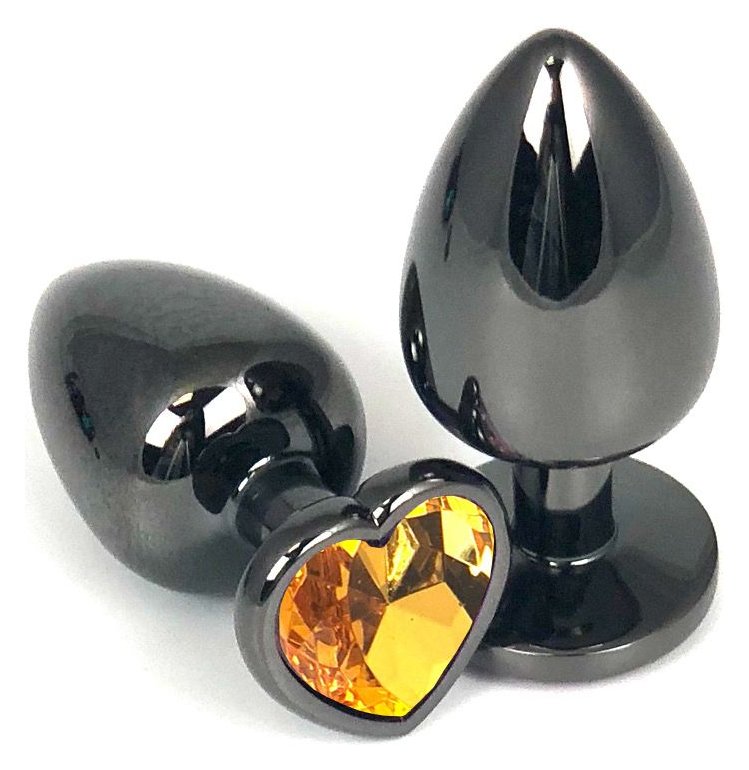 Черная металлическая анальная пробка с оранжевым стразом-сердечком - 6,5 см