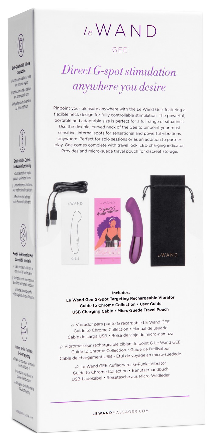 Le Wand Gee — вибростимулятор для точки G с характерным сплющенным кончиком и гибким стержнем для точного контроля. Он рассчитан на глубокий внутренний массаж в разных позах и удобно лежит в ладони. Материалы — безопасный металл и силикон, а беспроводной формат упрощает использование. Есть 6 уровней интенсивности и 15 паттернов, а также трэвэл-лок, чтобы избежать случайных включений в дороге. Зарядка занимает около 2 часов и даёт до 2 часов работы; корпус защищён от брызг.