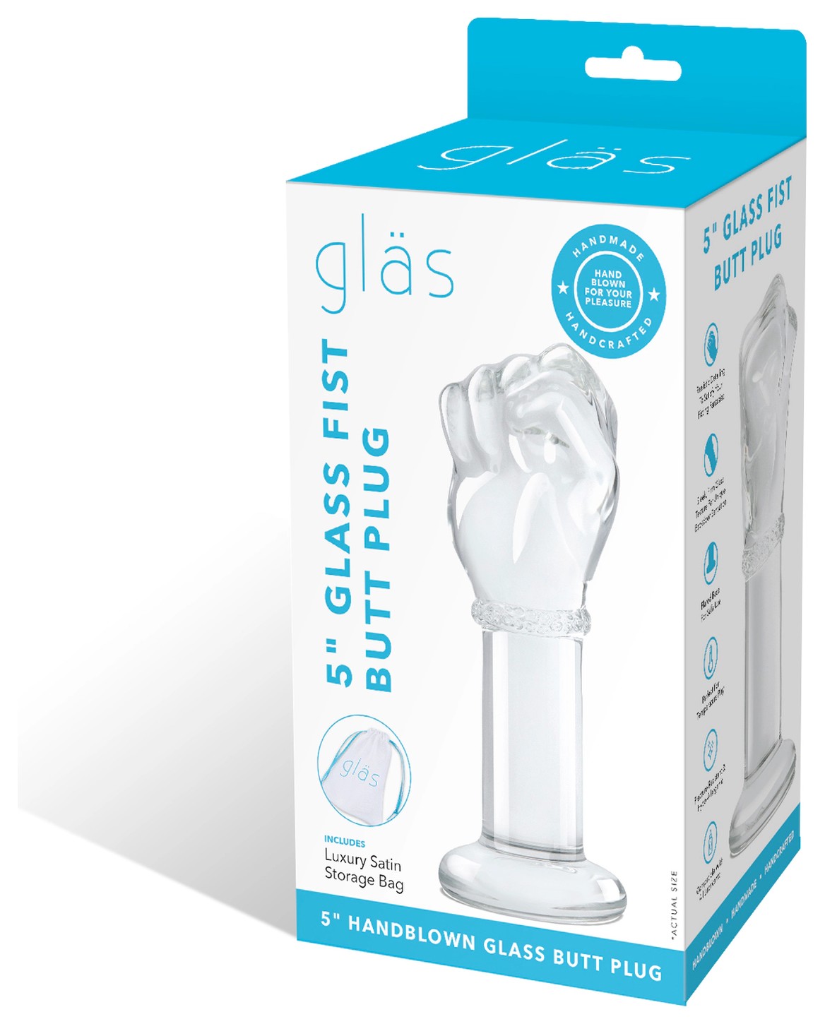 Стеклянный плаг Glass Fist Butt Plug в форме сжатой в кулак руки предлагает уникальные и интенсивные ощущения для опытных партнеров в анальном проникновении. Этот авантюрный инструмент для удовольствия повторяет реалистичные контуры кулака, создавая ощущения, недоступные в обычных анальных пробках. Изготовленный из безопасного для тела гипоаллергенного стекла, он легко чистится и идеально подходит для температурных игр — просто нагрейте в горячей воде или охладите при помощи холодной. Может использоваться с абсолютно любыми видами гелей-смазок. Пробка с толстым расширяющимся основанием удобна в использовании и обеспечивает безопасность. Длина изделия составляет 13 см, что обеспечивает глубокую и интенсивную стимуляцию.