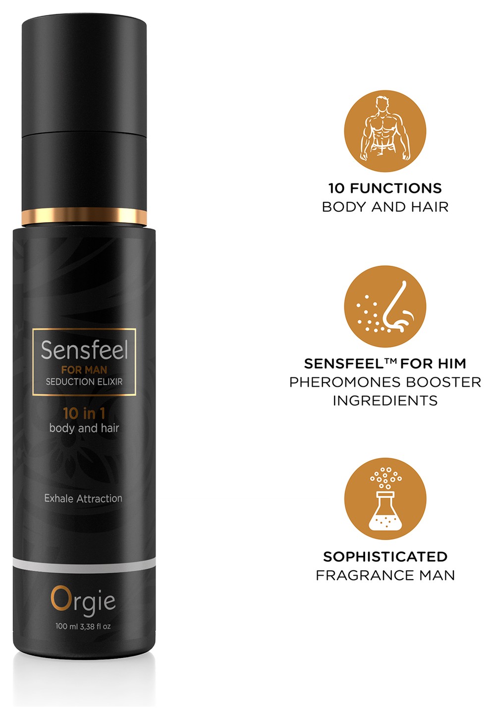 Многофункциональный лосьон для тела и волос с феромонами Orgie Sensfeel For Man Pheromone Seduction Elixir сочетает уходовые свойства и афродизиак-эффект. Содержит 2% активатора феромонов Sensfeel for Him - максимальную рекомендованную концентрацию для эффективного действия. Лосьон Orgie Sensfeel For Man выполняет 10 функций: увлажняет кожу, придает волосам блеск, защищает от УФ-лучей, восстанавливает кончики, предотвращает спутывание, сохраняет цвет окрашенных волос, контролирует объем, дарит соблазнительный аромат и стимулирует физическое притяжение. Флакон объемом 100 мл рассчитан на 333 применения. Легкая невесомая текстура быстро впитывается без жирного блеска.