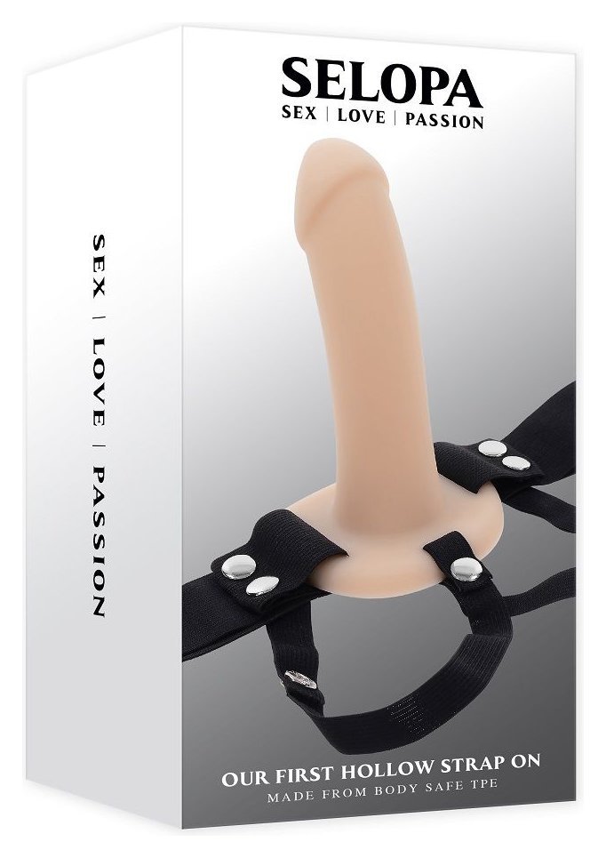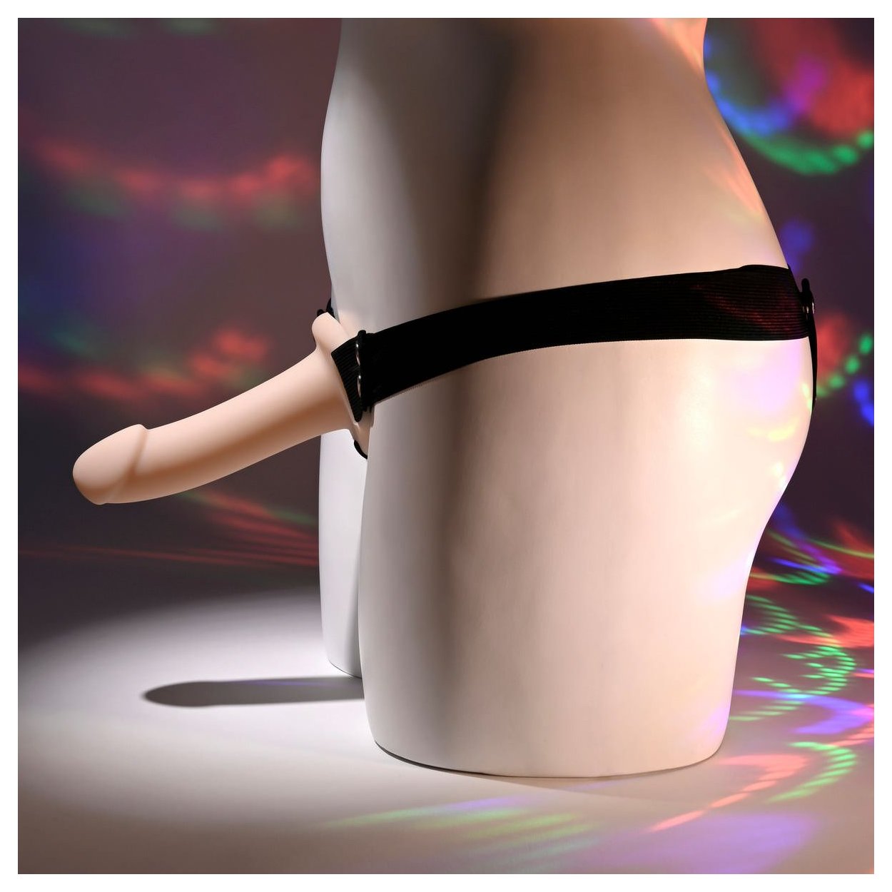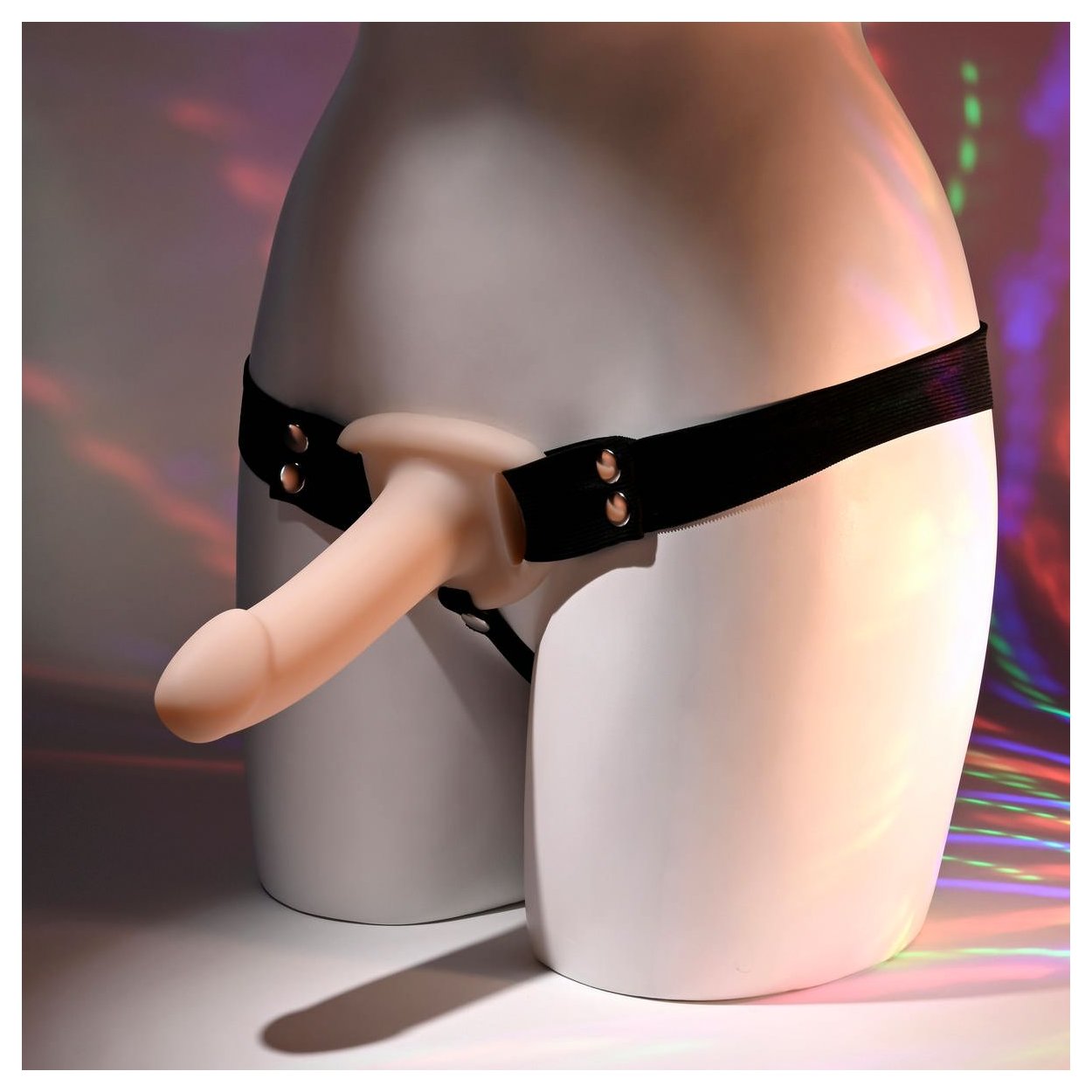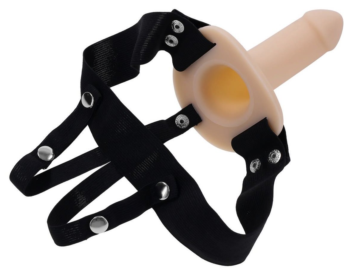 Телесный полый страпон с черными эластичными ремешками Our First Hollow Strap On