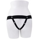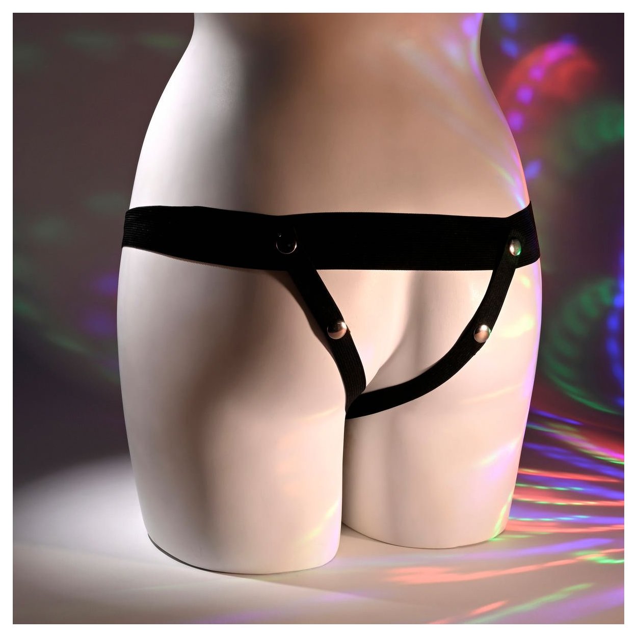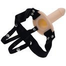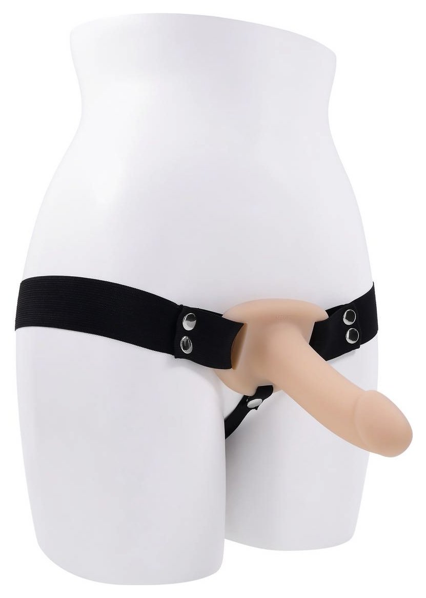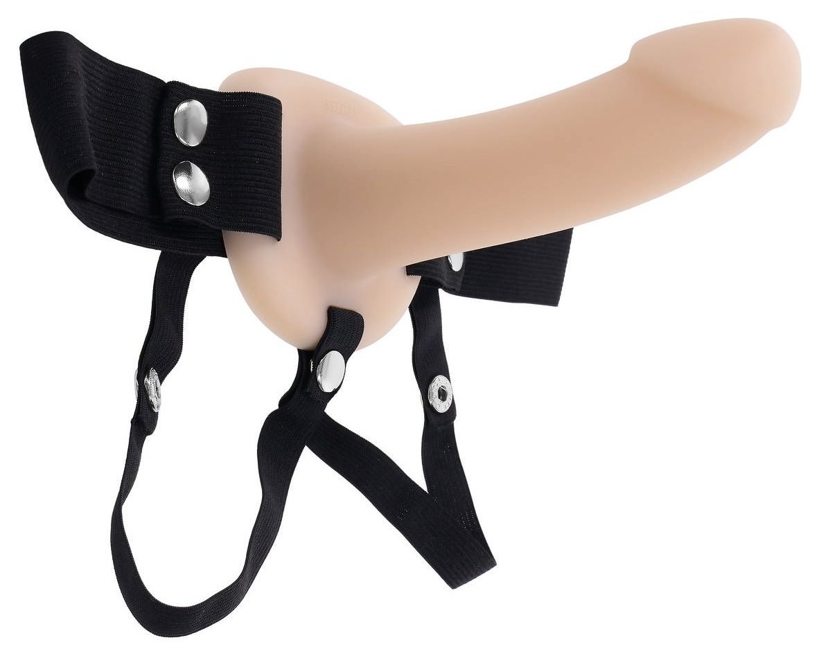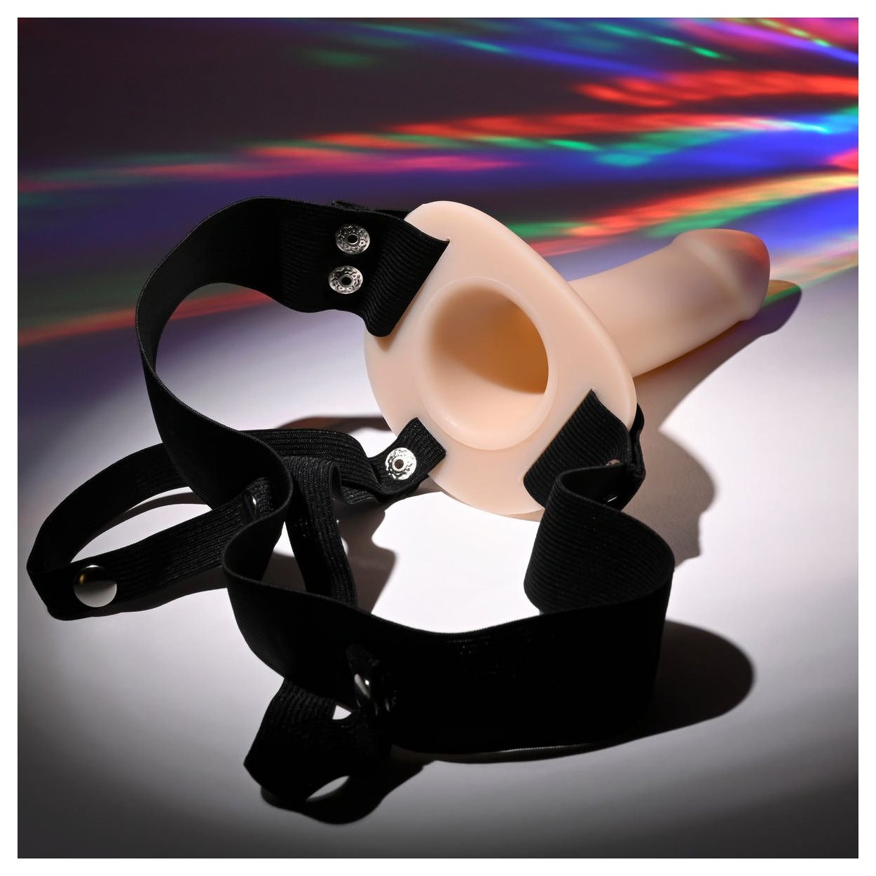Телесный полый страпон с черными эластичными ремешками Our First Hollow Strap On