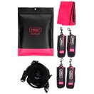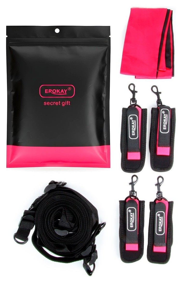 Черно-розовый эротический набор: фиксатор, оковы, наручники, повязка