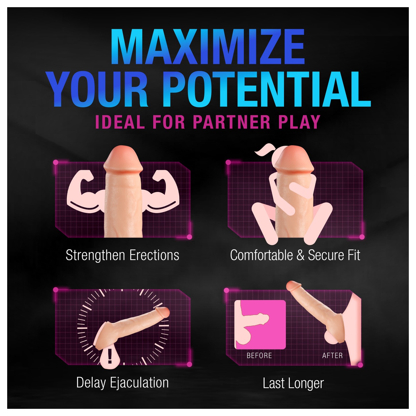 Наденьте насадку на пенис перед эрекцией. Закрепите подхват для мошонки для надежной фиксации. Используйте с лубрикантом для более комфортного скольжения. После использования промойте теплой водой с мылом.