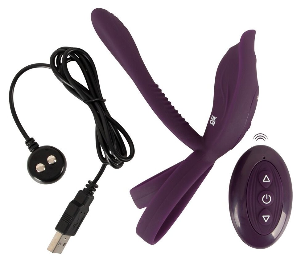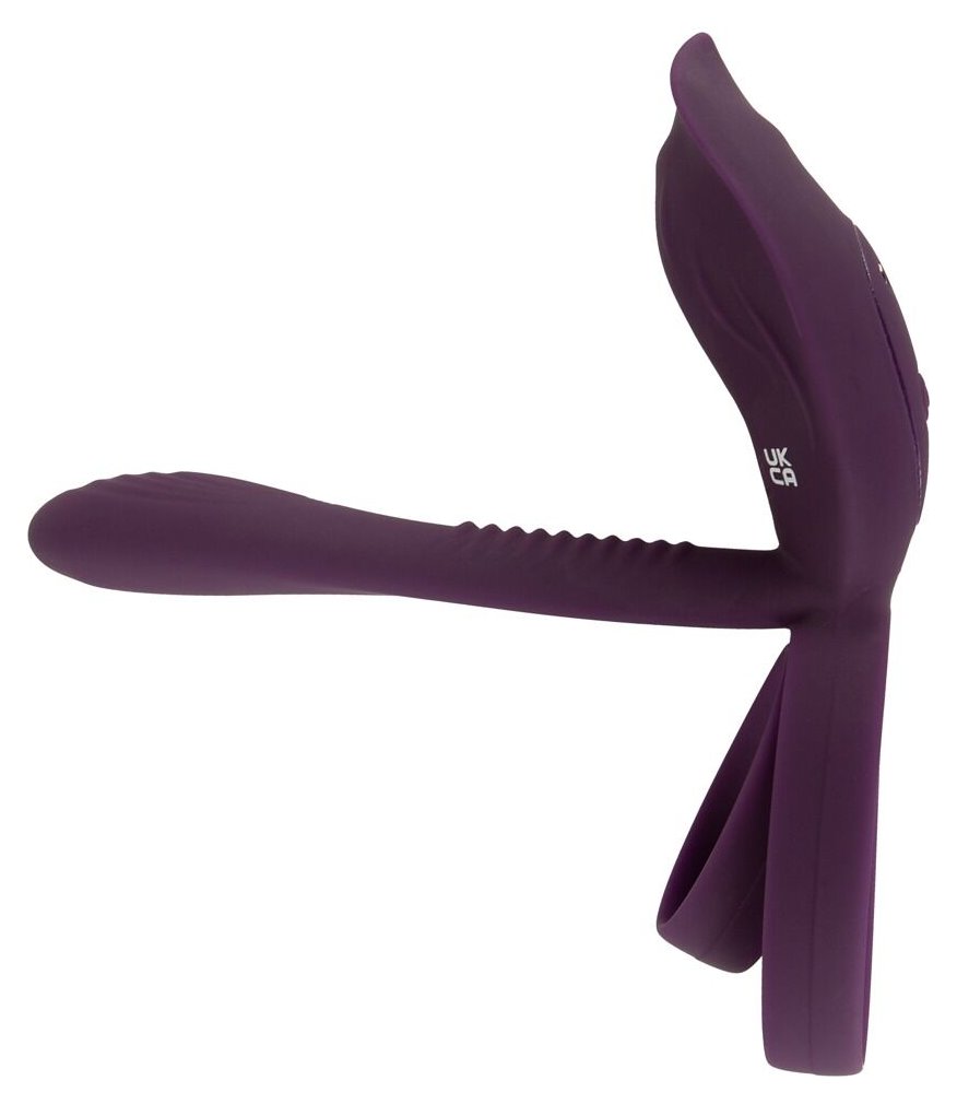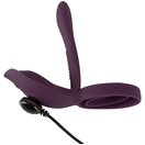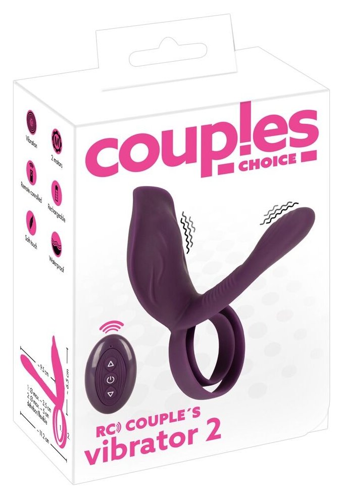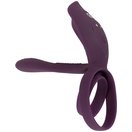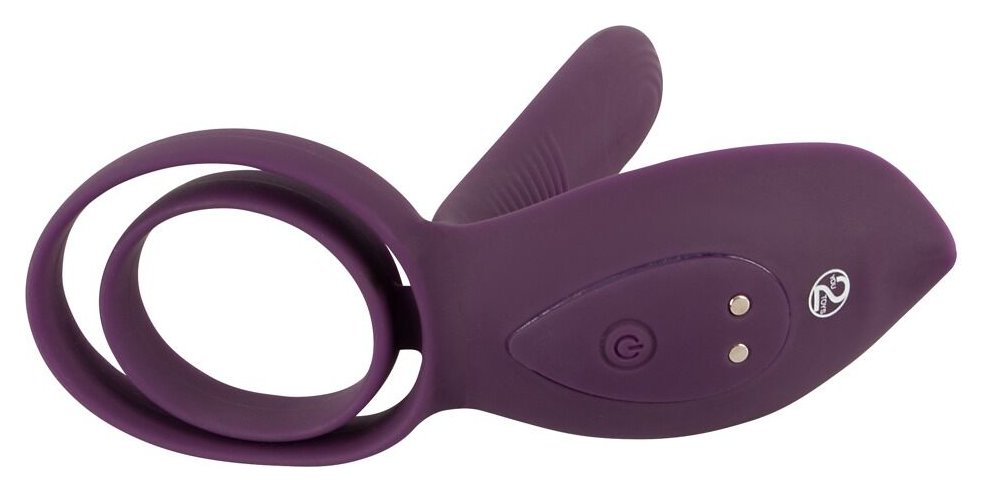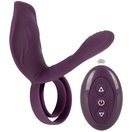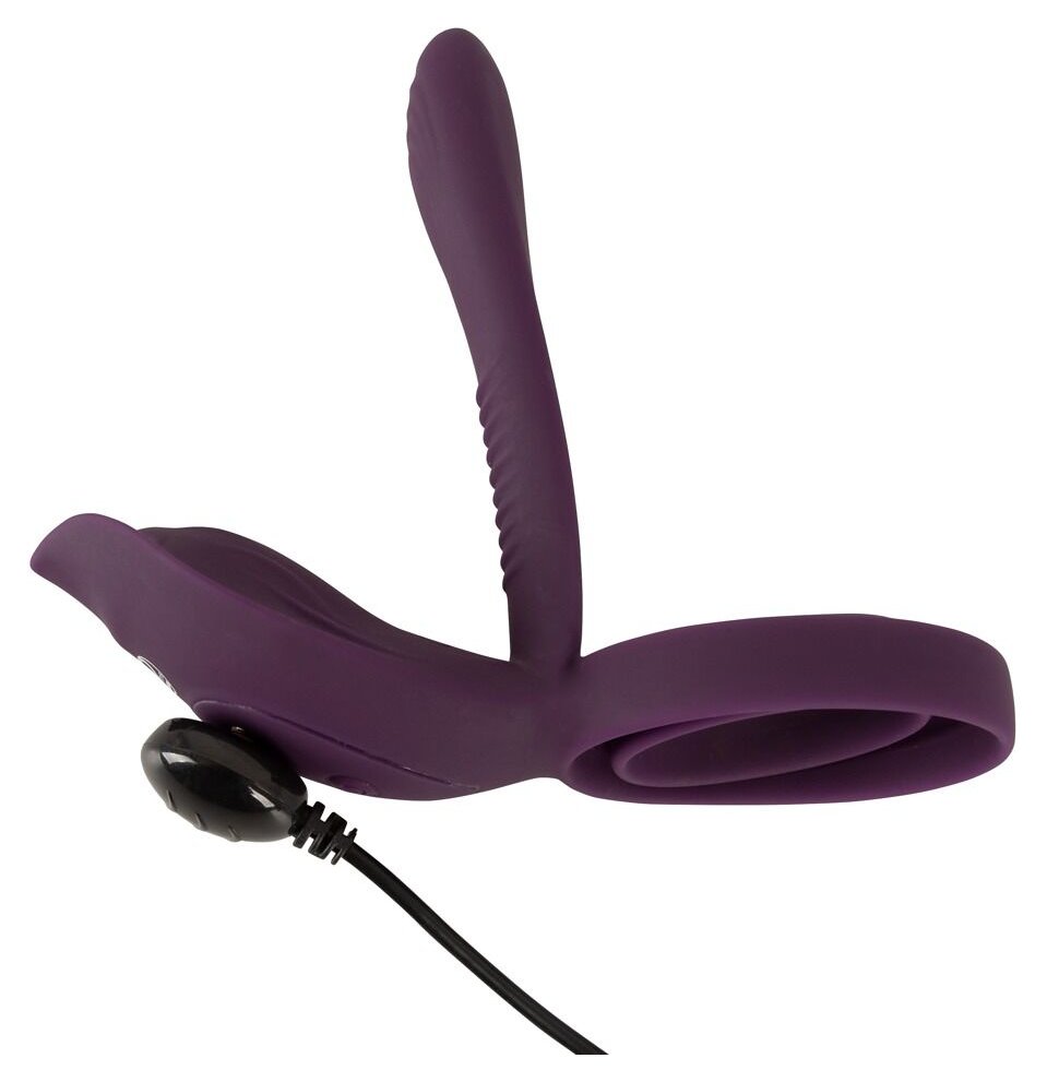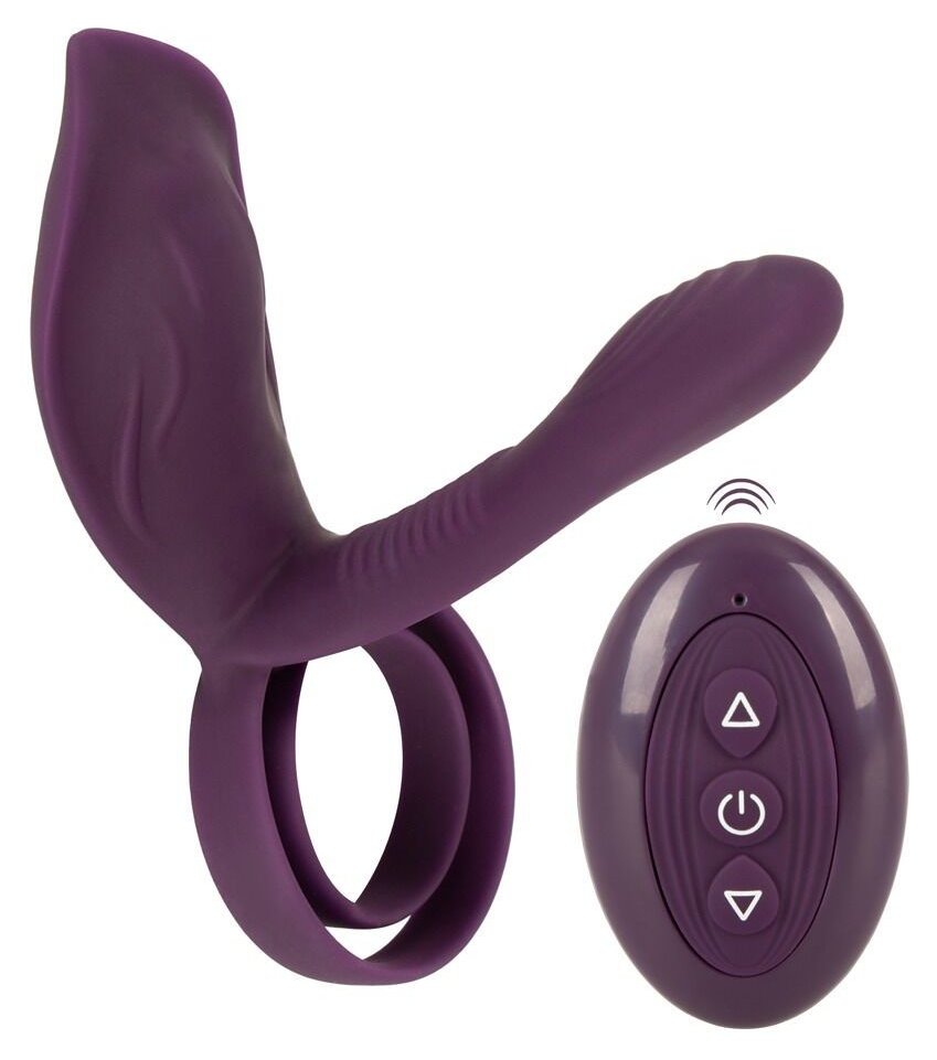 Фиолетовая насадка на член с клиторальным отростком и пультом ДУ RC Couple’s Vibrator 2