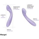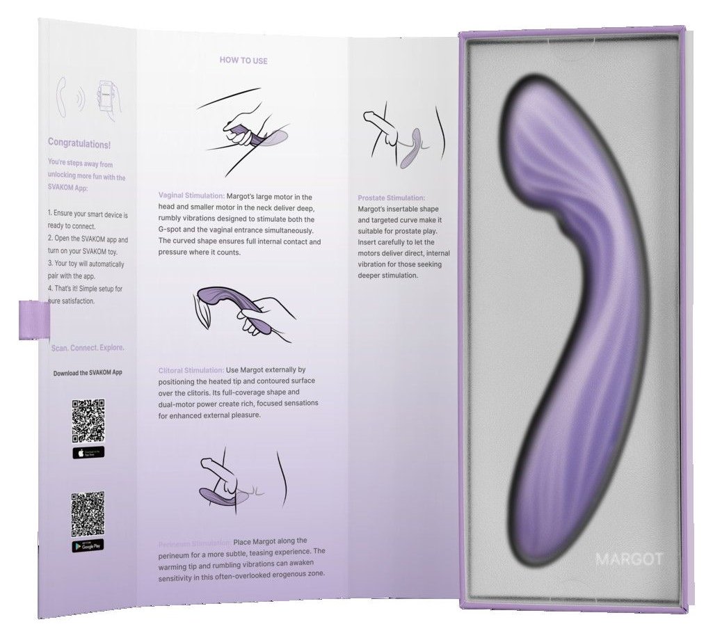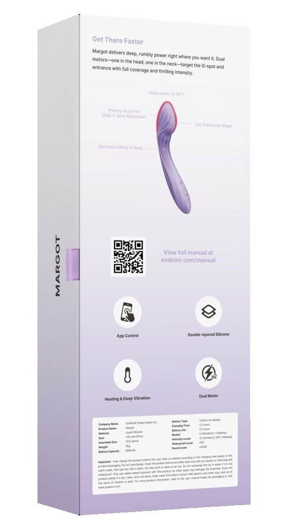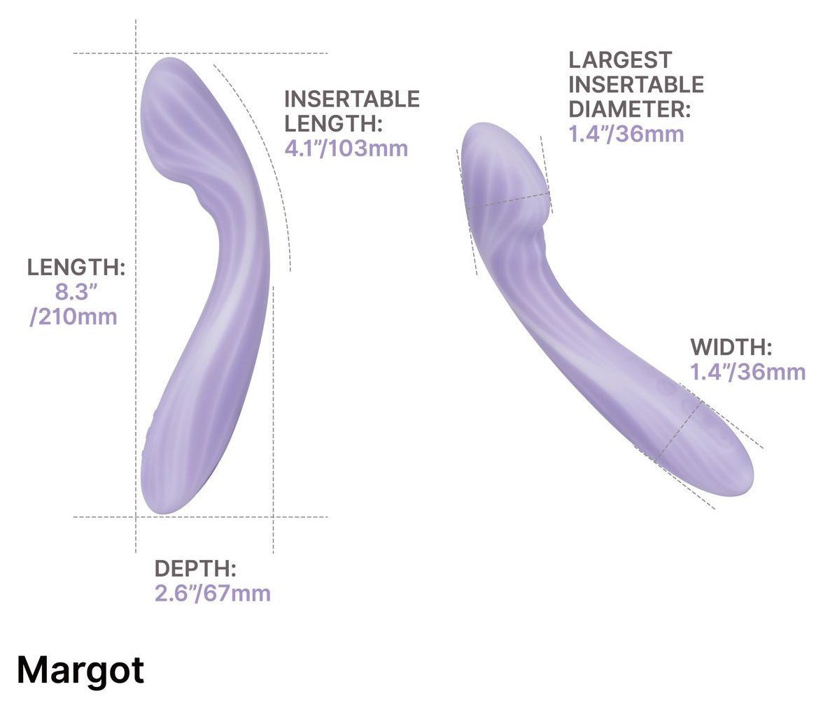 Margot выделяется среди других вибраторов наличием двух независимых моторов и функции нагрева. Эргономичный изгиб обеспечивает точную стимуляцию точки G. Двухслойное покрытие из жидкого силикона делает устройство невероятно мягким и приятным на ощупь. Возможность управления через приложение и синхронизации с контентом добавляет интерактивности.