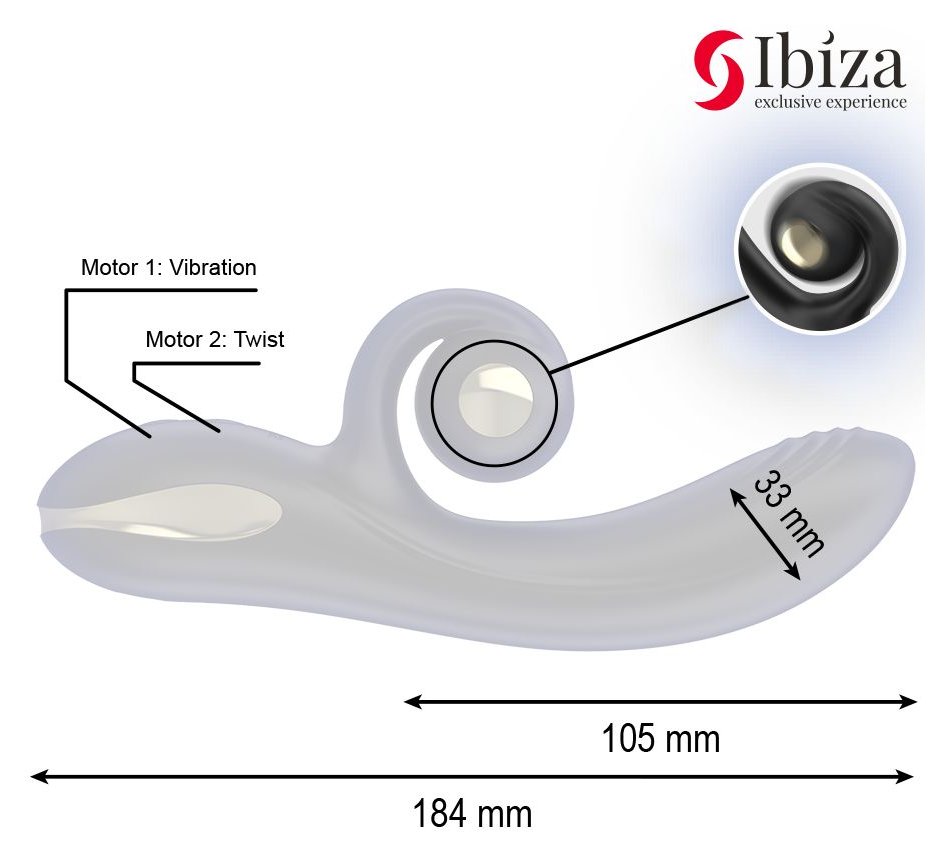 В ассортименте вибростимуляторы со стимулятором клитора есть в наличии товары для женщин поставщика Ibiza. Материал, которому отдают предпочтение наши покупатели, подбирая себе один из этих товаров - силикон. А предпочитаемые размеры: диаметр 3.3 см, длина 18.4 см.