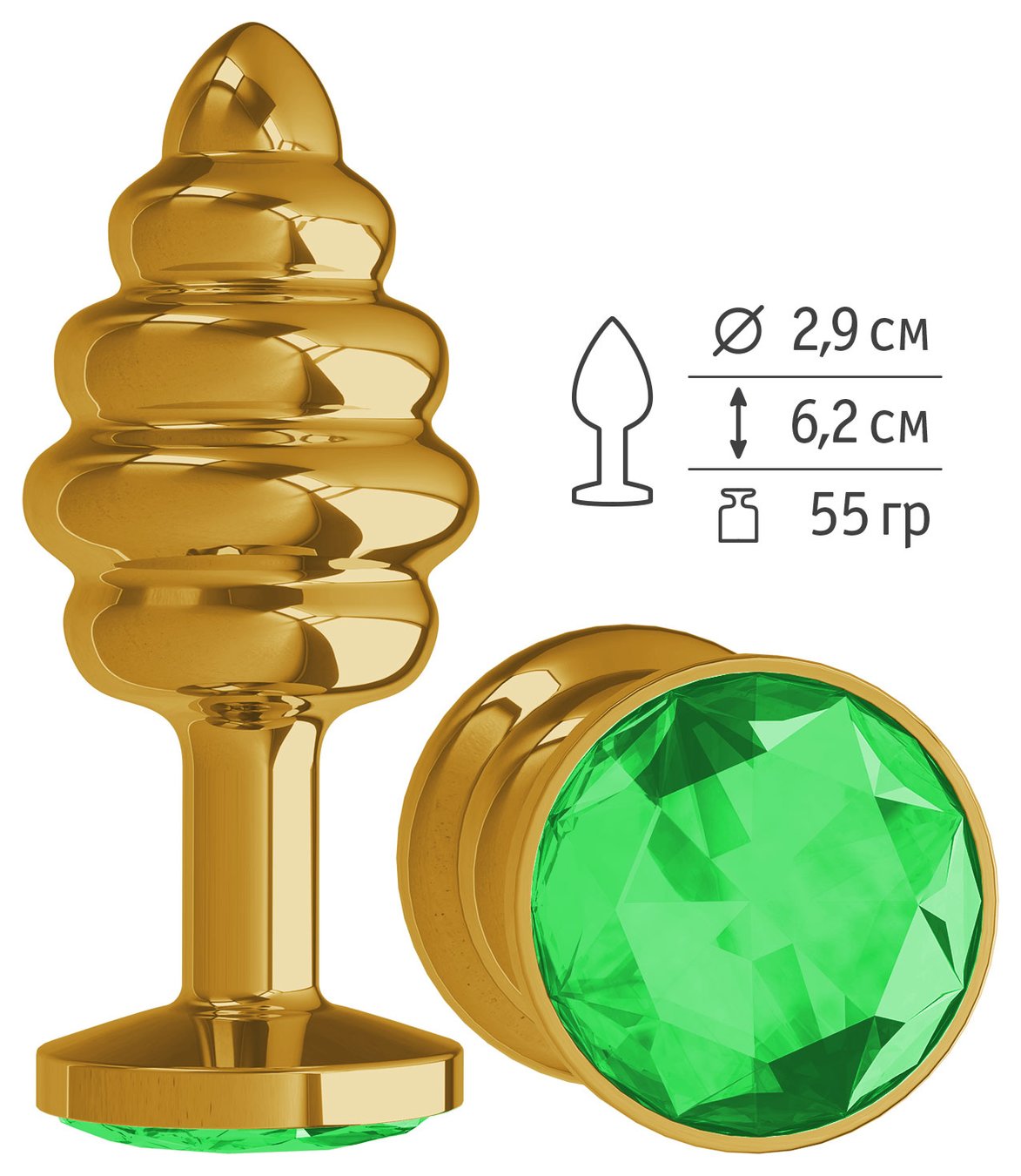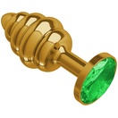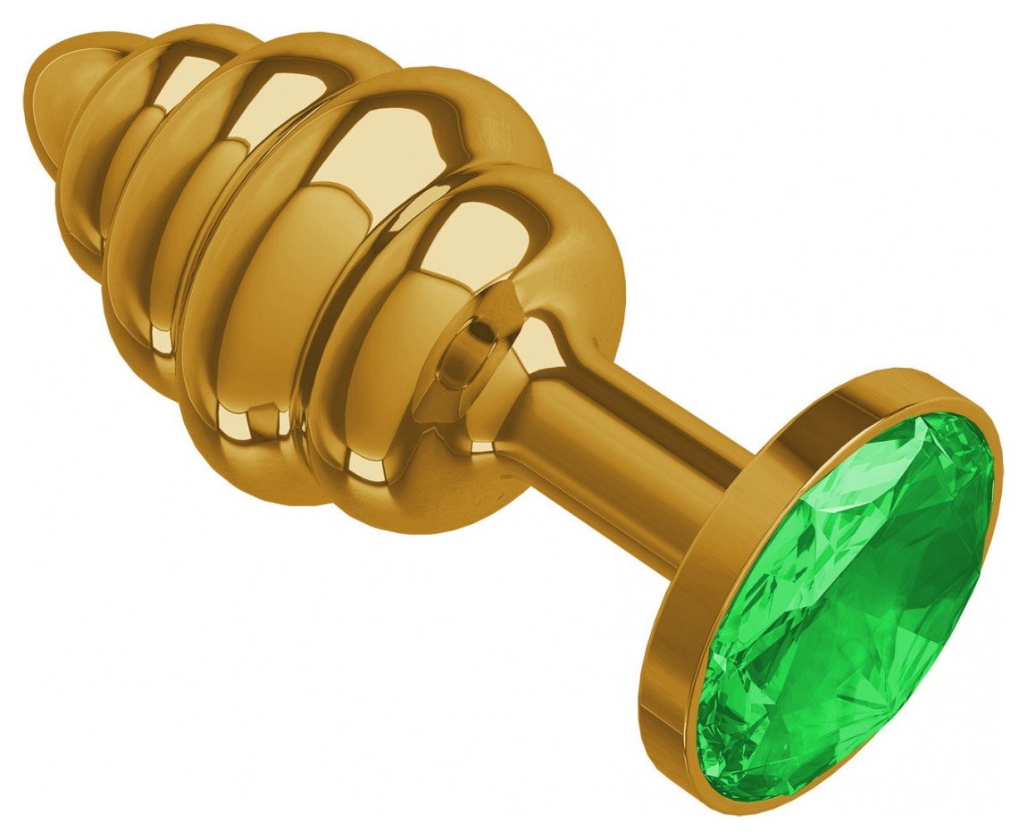 Золотистая пробка с рёбрышками и зеленым кристаллом - 7 см